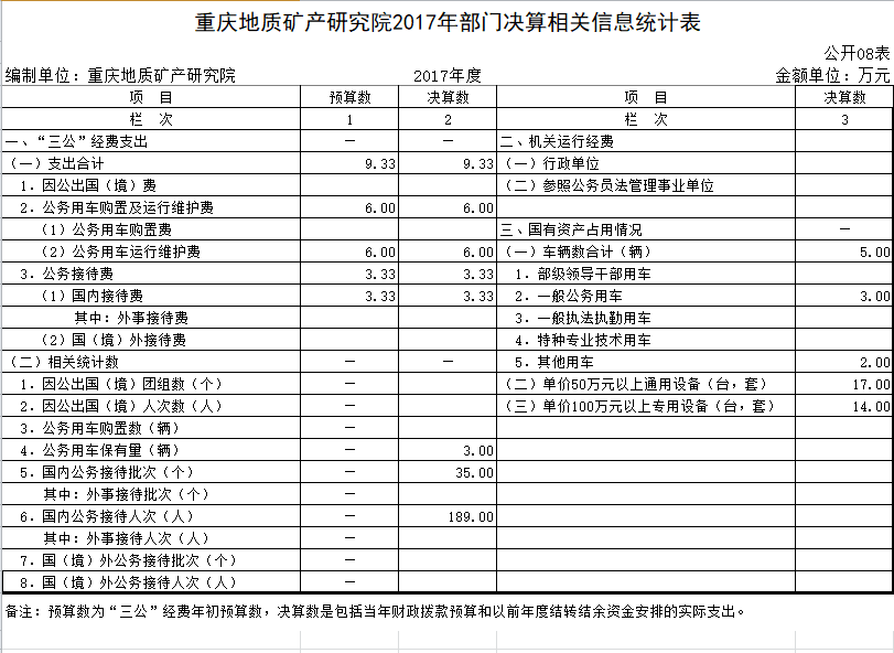 2017年度本部门因公出国(境)费用0.00万元,费用支出与年初预算数和上年支出数持平。公务车购置费0.00万元,费用支出与年初预算数和上年支出数持平。公务车运行维护费6.00万元,费用支出与年初预算数和上年支出数持平。公务接待费3.33万元,费用支出与年初预算数和上年支出数持平。