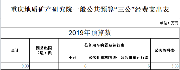 2019年“三公”经费预算9.33万元,与2018年持平。其中:因公出国(境)费用0万元,与2018年一致;公务接待费3.33万元,较2018年无变化;公务用车运行维护费6万元,较2018年无变化;公务用车购置费0万元,与2018年一致。